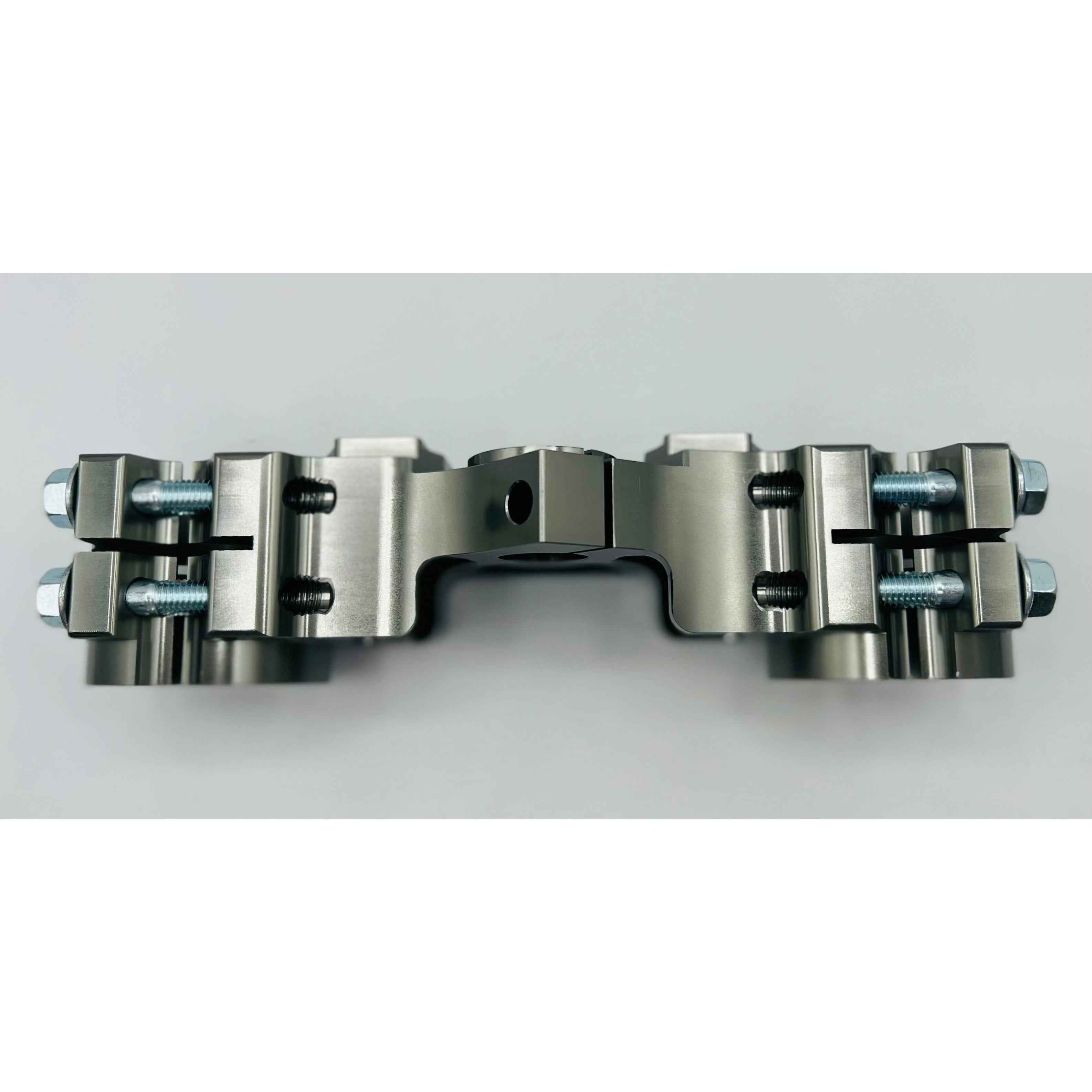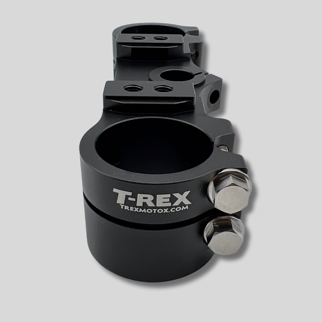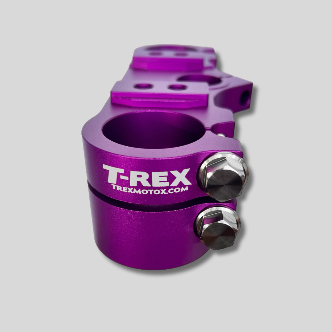 Cobra Clamps include adjustable T-Rex Billet Bar Mounts, allowing you to move the handle bars forward or backward for a more comfortable position. The universal bar mount allows greater flexibility in bar size and height. The T-Rex Triple Clamp split clamp design increases stability and eliminates forks twisting in the triple clamps. Your forks can be extended lower in these clamps, increasing performance and reducing head shake. The billet material is significantly stronger and thicker, eliminating bar mount bolts pulling out of the triple clamps in high speed impacts. Our test riders refuse to use stock triple clamps after using the T-Rex Triple Clamp, the bike is way more stable and more predictable. Keeping the stock lower clamp makes for easy installation and allows the forks to flex and not feel harsh.